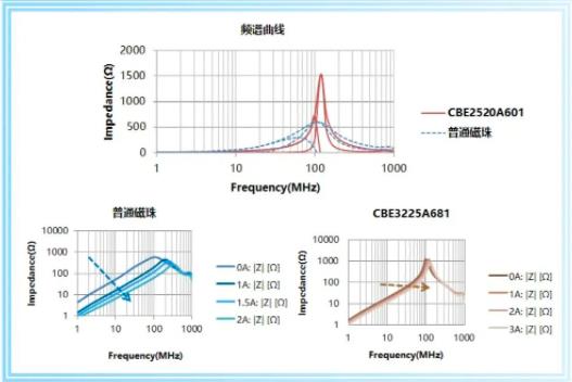 CBE系列片式磁珠具有低直流電阻(DCR)、高額定電流 (Ir)的特點,產(DCR)、品通流能力出色,同時,CBE在特定頻率區間(100~400MHz)內具有較高的阻抗值,可有效濾除該頻段噪聲。音頻磁珠CBE產品電流穩定性優秀,在較大電流通過時仍能保持較高阻抗值,大電流下阻抗變化率較小,耐電流特性好.