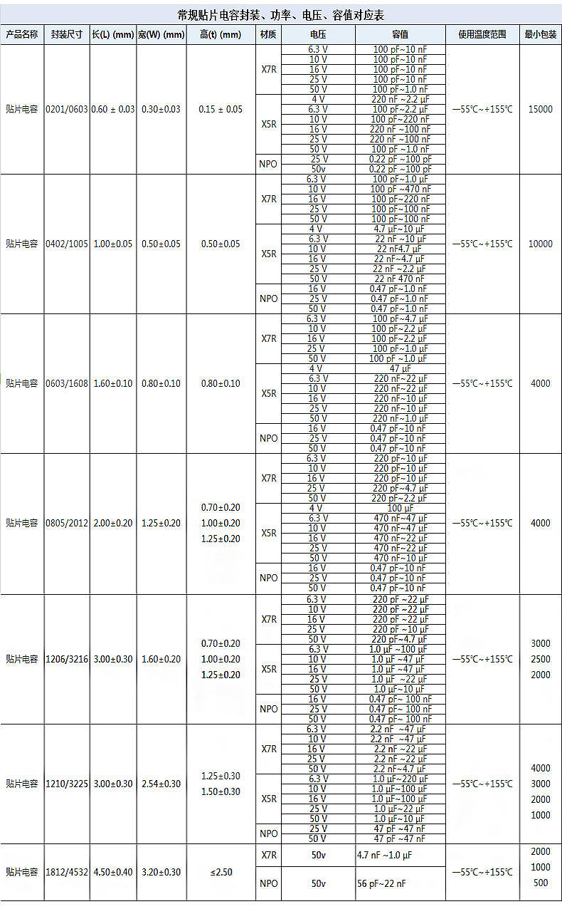 貼片電容封裝,功率,電壓,容值對應(yīng)表