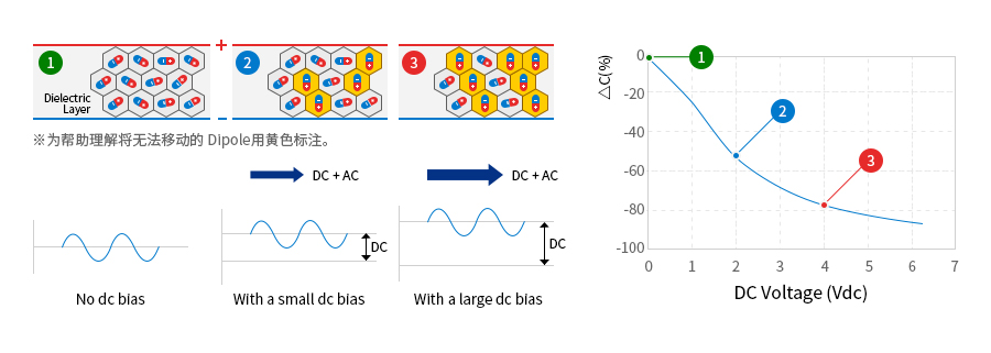 像Class2 產(chǎn)品,電介質(zhì)內(nèi)的 Dipole在加 DC 電壓后,會(huì)按照電壓所處的方向整齊排列,當(dāng)所加的 DC 電壓變大,因 DC 電壓而固定方向的 Dipole也會(huì)增加。MLCC的容量由對(duì) AC 電壓做出反應(yīng)的 Dipole決定,由DC 電壓固定的 Dipole越多對(duì) AC 電壓做出反應(yīng)的 Dipole 就會(huì)越少,從而導(dǎo)致容量下降。